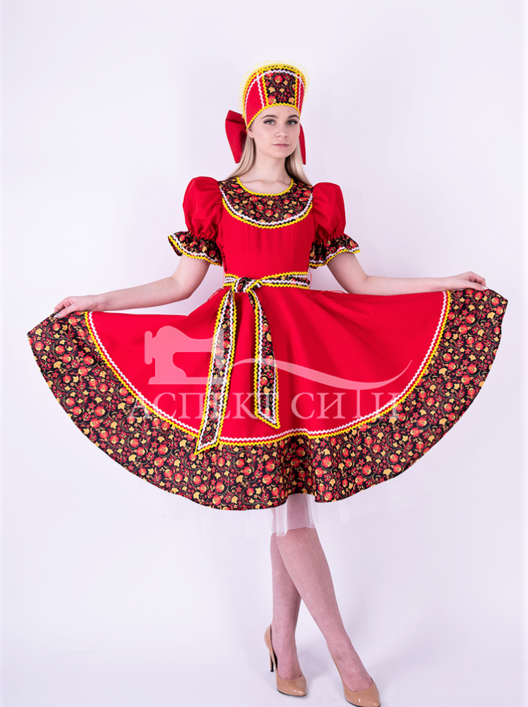 Плясовой костюм "Дарина" состоит из платья и кокошника. Платье выполнено из габардина.По бокам шнуровка, что позволяет отрегулировать платье по талии, в комплекте пояс. Кокошник сзади украшен роскошным объемным бантом.