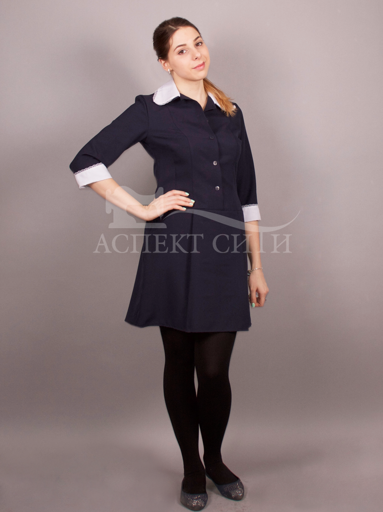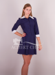 Школьное платье синего цвета с заниженной талией, юбка с 2-мя складками спереди и сзади, лиф платья застегивается спереди на пуговицы, воротник отложной, накладные манжеты и воротник, которые входят в комплект. Длина рукава 3/4. Ткань костюмная, габардин.