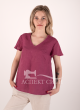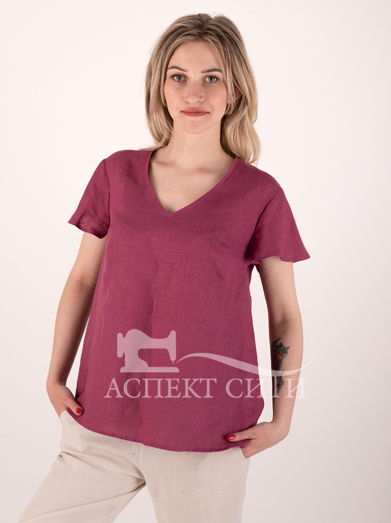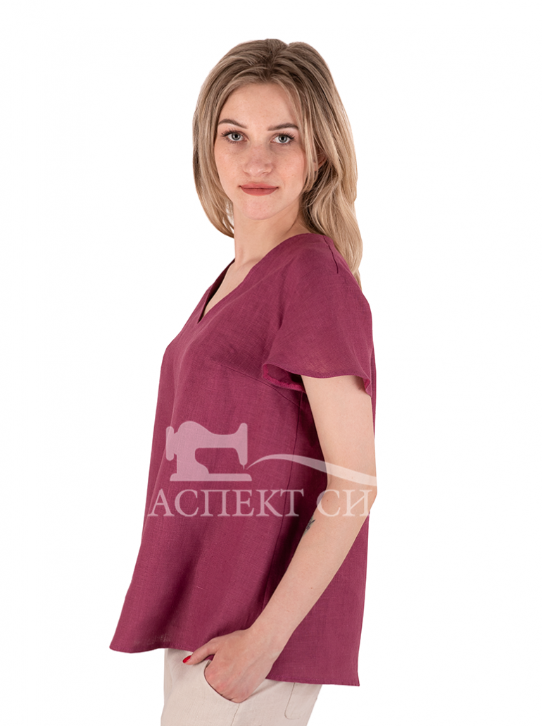 Блуза а-силуэта с коротким рукавом. Рукав немного расклешен. Прекрасно сочетается с юбкой или брюками. Льняная ткань красивого сливового цвета.