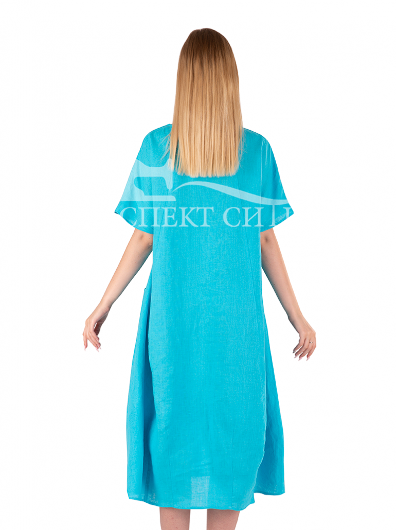 Платье-баллон макси-длины, из льняной ткани сочного цвета. Полочка и спинка с рельефами из среза горловины. Рукав цельнокроеный, вырез горловины круглый. Платье с двумя карманами. В комплекте пояс. Параметры модели на фото 42-175.