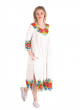 Комфортное платье белого цвета с яркой отделкой. Сшито из полульняной ткани. Полочка на кокетке, со складками на уровне груди. В боках карманы и разрезы. Рукав три четверти.