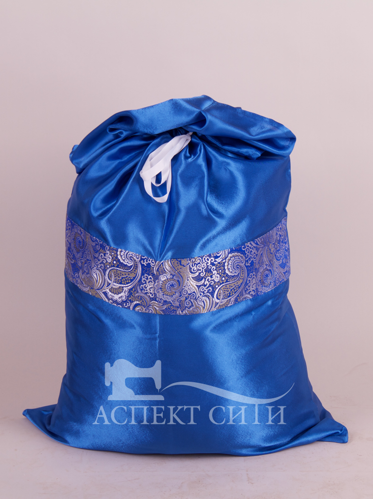 Мешок для подарков к костюму Деда Мороза. Выполнен из атласа синего цвета со вставкой из парчи с металлизированной нитью золотого цвета.