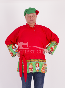 Мужская косоворотка из хлопка, крой в традиционном русском стиле, завязывается на пояс, отделка тканью в дизайне "Матрешки".