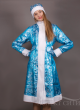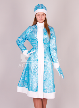 Костюм Снегурочки из ткани парча-жаккард (цвет бирюза + металлизированная нить цвета серебро), отделка флис белый. В комплекте: шубка, шапка, варежки. Шубка- цельнокроеное шестишовное платье с центральной застежкой на "липучки", воротник -стойка, рукав длинный, сзади на талии пояса-завязки. Длина-ниже колена. Варежки из флиса. Шапочка из основной ткани, отделка белый флис. Рост модели 178 см