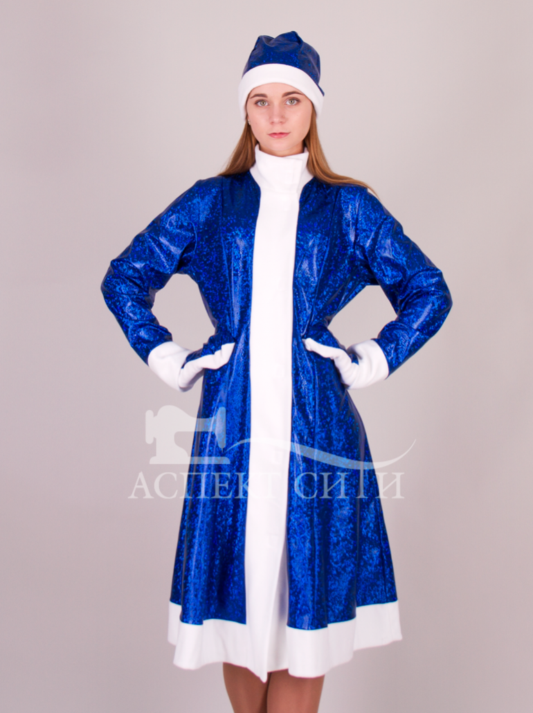 Костюм Снегурочки из ткани голограмма синего цвета, отделка флис белый. В комплекте: шубка, шапка, варежки. Шубка- цельнокроеное шестишовное платье с центральной застежкой на "липучки", воротник -стойка, рукав длинный, сзади на талии пояса-завязки. Длина- под колено. Варежки из флиса. Шапочка с отворотом. Рост модели 178 см