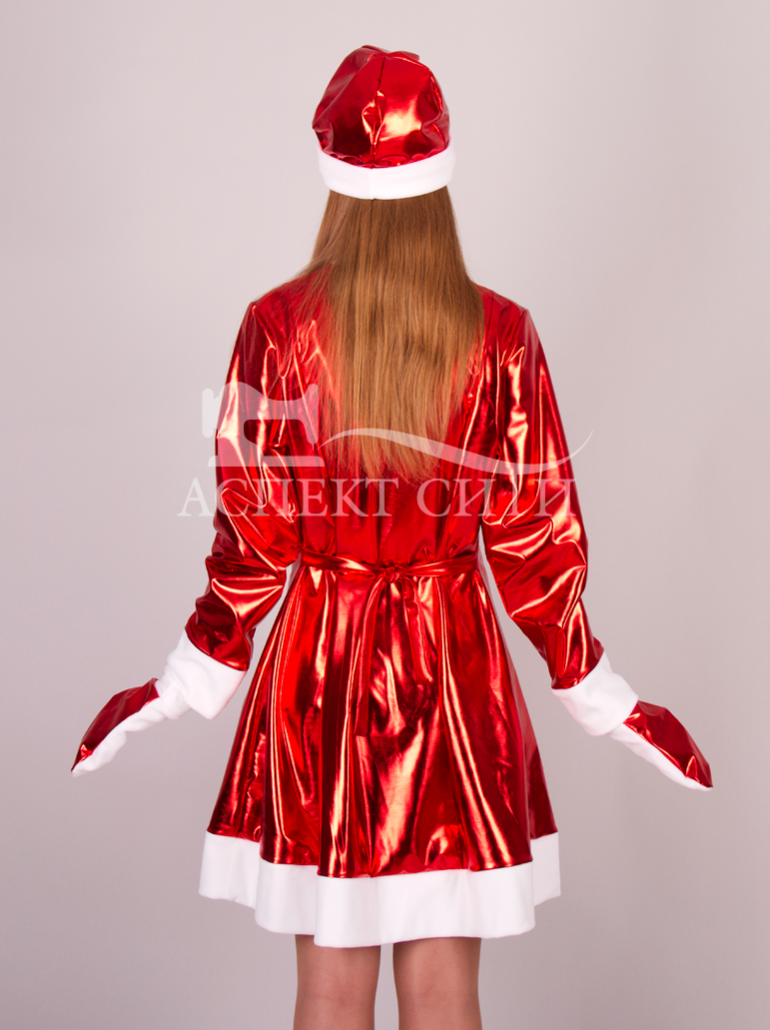 Костюм Снегурочки из ткани парча-стрейч красного цвета, отделка флис белый. В комплекте: шубка, шапка, варежки. Шубка- цельнокроеное шестишовное платье с центральной застежкой на "липучки", воротник -стойка, рукав длинный, сзади на талии пояса-завязки. Длина-до колена. Варежки из флиса. Шапочка с отворотом. Рост модели 178 см