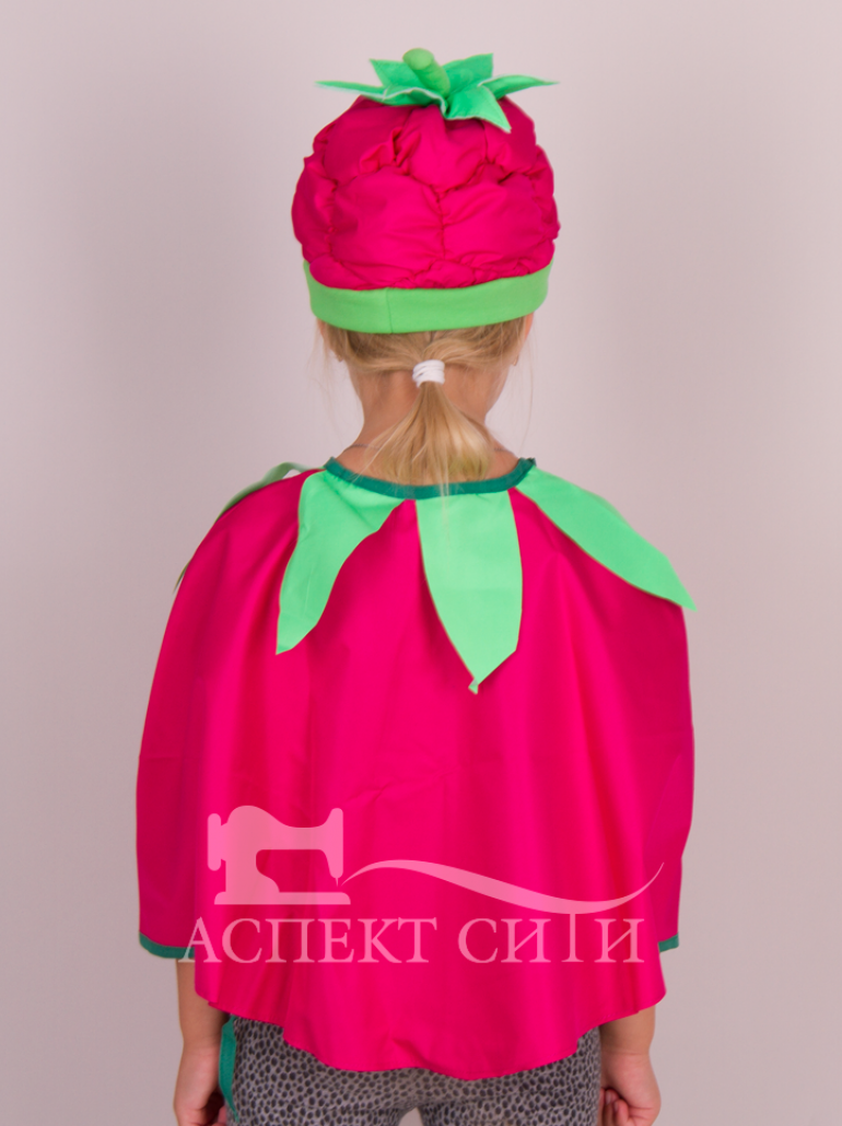 Костюм малинки состоит из шапочки и туники, декорирован листочками. Подходит как девочкам, так и мальчикам ростом от 104 до 134 см. Подкладка шапочки из 100% хлопка.