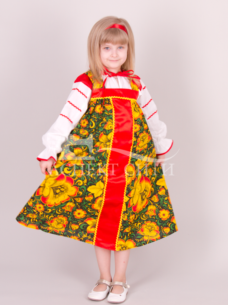 Народный сарафан для девочек выполнен из 100% хлопка с атласной отделкой. Подойдет как для танца и выступлений, так и для образа на праздник Масленицы. Блуза и повязка в комплект не входят!
