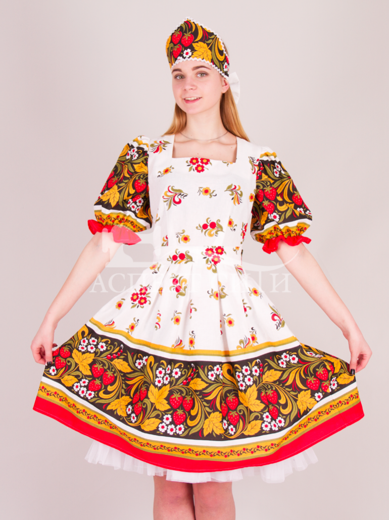 Плясовой костюм "Хохлома" состоит из платья и кокошника. Платье из хлопковой ткани с содержанием льна, юбка вскладку, на подкладке с двумя ярусами жесткой сетки, на талии платья завязывается пояс с самостоятельным аксессуаром - объемным бантом. Лиф платья прилегающего силуэта, рукава "фонарик" на резинке. Кокошник сзади также дополнен бантом.