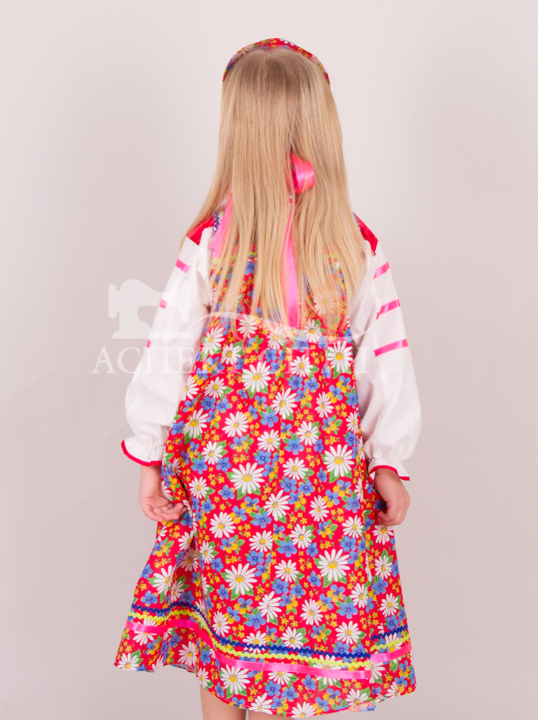 Русский народный костюм для девочки из чистого хлопка с набивным рисунком. Сарафан, блуза и головной убор декорированы атласной ярко-розовой тесьмой и разноцветным вьюнком.
