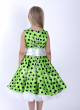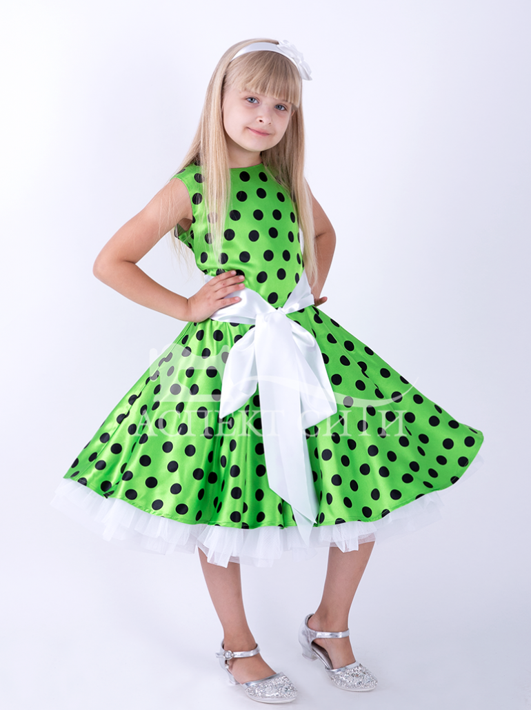 Платье для девочки из атласной ткани в черный горох на зеленом фоне, отделка желтая (пояс, подъюбник). Отрезное по линии талии, юбка платья - полное солнце, длина под колено. В среднем шве спинки-потайная молния и шнуровка для регулирования объема. Лиф платья без рукава, на хлопковой подкладке. Нижняя юбка пришита к платью, повторяет крой основной юбки платья, низ оформлен двойным рюшем из белой жесткой сетки, что придает пышность платью. Атласный белый пояс завязывается на бант.