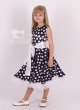 Платье для девочки из атласной ткани в белый горох на темно-синем фоне, отделка белая (пояс, подъюбник). Отрезное по линии талии, юбка платья - полное солнце, длина под колено. В среднем шве спинки-потайная молния и шнуровка для регулирования объема. Лиф платья без рукава, на хлопковой подкладке. Нижняя юбка пришита к платью, повторяет крой основной юбки платья, низ оформлен двойным рюшем из белой жесткой сетки, что придает пышность платью. Атласный белый пояс завязывается на бант.