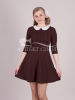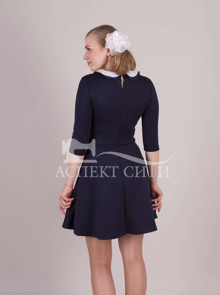 Платье школьное синего цвета из плотного трикотажного полотна, отрезное по линии талии, юбка расклешенная. Лиф платья на полочке с рельефом из плеча, рукав втачной, длиной 3/4, воротник закругленной формы, плосколежащий. Платье застегивается сзади на воздушную петельку и пуговицу. В комплекте накладной белый воротник для самостоятельного пришивания ручными стежками. Длина изделия 85 см для размера 42 ( по среднему шву спинки).
