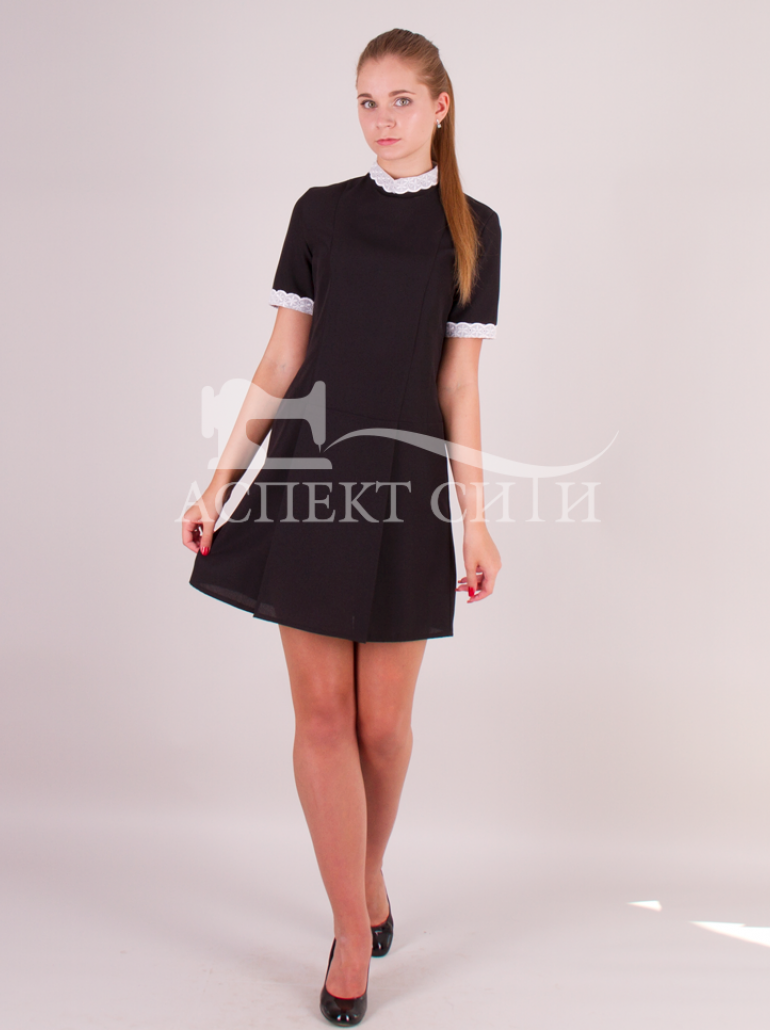 Платье с заниженной талией, юбка платья с 2-мя складками спереди и сзади, на спинке в среднем шве молния, воротник- стойка, накладные манжеты и воротник из шитья. Ткань платья - костюмная - габардин черного цвета. Рукав короткий.