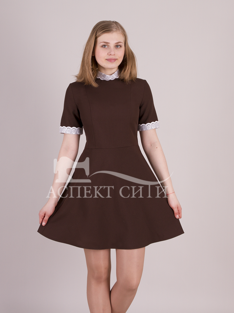Школьное платье с отрезной линией талии, юбка расклешенная, на спинке в среднем шве молния, воротник- стойка, накладные манжеты и воротник из шитья входят в комплект и пришиты к платью. Рукав короткий. Ткань плательно-костюмная, габардин коричневого цвета, 100% полиэстер.