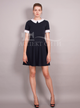 Платье школьное из дышащей мягкой ткани с содержанием вискозного волокна. Лиф платья с рельефами спереди. Платье отрезное по линии талии, юбка расклешенная, воротник уголками, плосколежащий. Платье застегивается сзади на потайную молнию длиной 55 см. В комплекте накладной белый воротник из 2-х частей и манжеты, которые пришиты к платью. Воротник и манжеты до стирки нужно отпороть и после нее пришивать ручными стежками! Длина изделия 86 см для размера 42 (по среднему шву спинки от седьмого шейного позвонка до низа изделия).