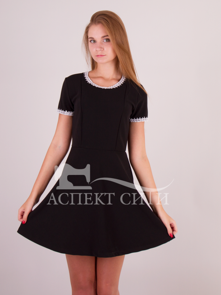 Платье черного цвета, отрезное по линии талии, рукав короткий, лиф платья с рельефами, круглый вырез горловины. Сшито из плотной трикотажной ткани, отлично садится по фигуре. Комплектуется кружевом для самостоятельного пришивания ручными стежками.