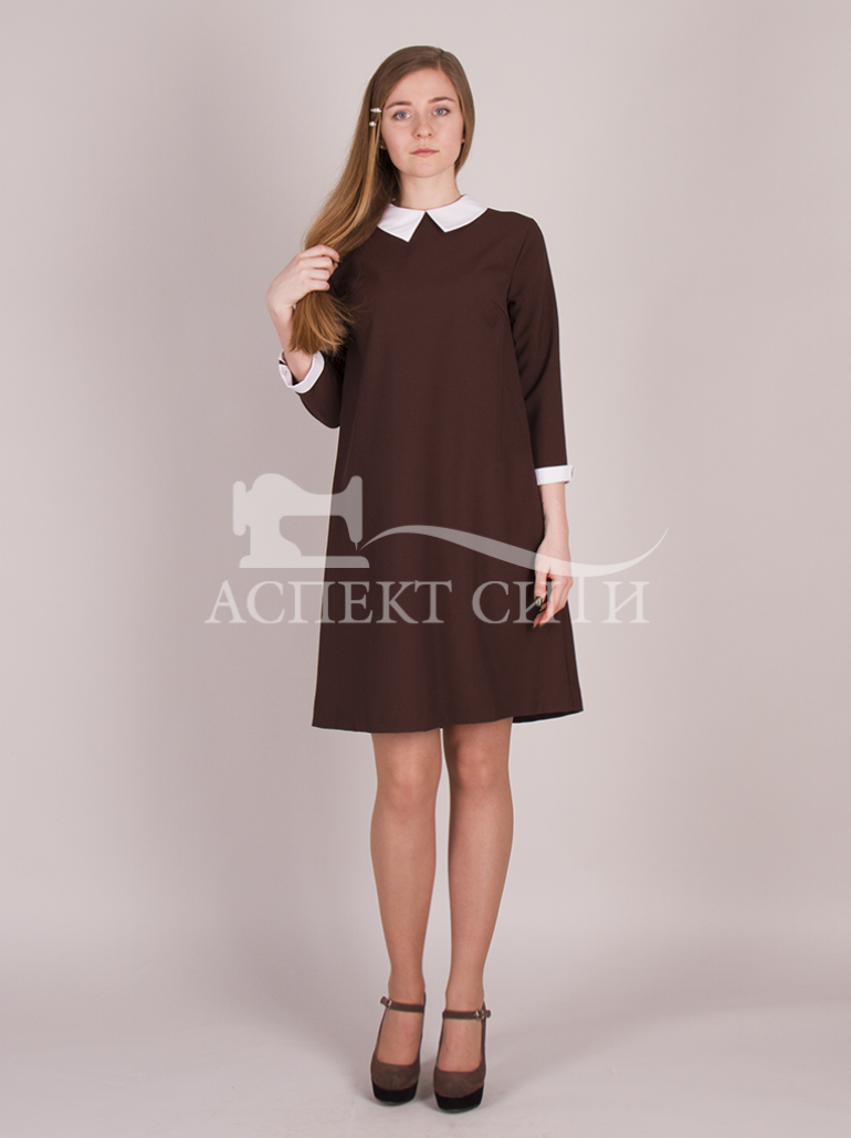 Платье школьное поливискозное, коричневого цвета. А-силуэт, рукав три четверти. Полочка с нагрудной вытачкой, в среднем шве спинки потайная молния. Вырез горловины круглый, оформлен обтачками. Платье комплектуется съемными манжетами и воротником остроугольной формы белого цвета, которые пристегиваются на петли-пуговицы. Низ платья подогнут потайными стежками на подшивочном оборудовании. Ткань платья с содержанием вискозы, что позволяет использовать платье на каждый день, а не только для эпизодического ношения.