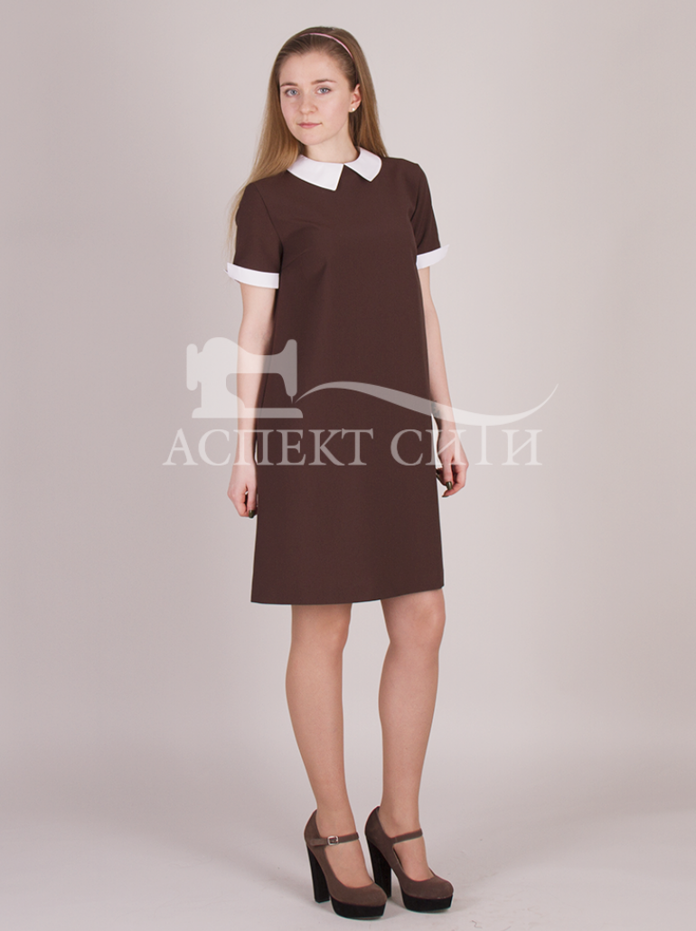 Платье для школы и для последнего звонка, А-силуэт, рукав короткий. Из поливискозного полотна, с содержанием вискозы 30%, что позволяет использовать изделие на каждый день. Платье коричневого цвета, прямого силуэта, слегка расклешено книзу. Полочка с нагрудными вытачками, на спинке в среднем шве молния. Вырез горловины круглый, оформлен обтачками. Рукав короткий. Платье комплектуется пристегивающимися на петли-пуговицы воротником и манжетами белого цвета, остроугольной формы - легко носить, снимать, одевать, стирать.