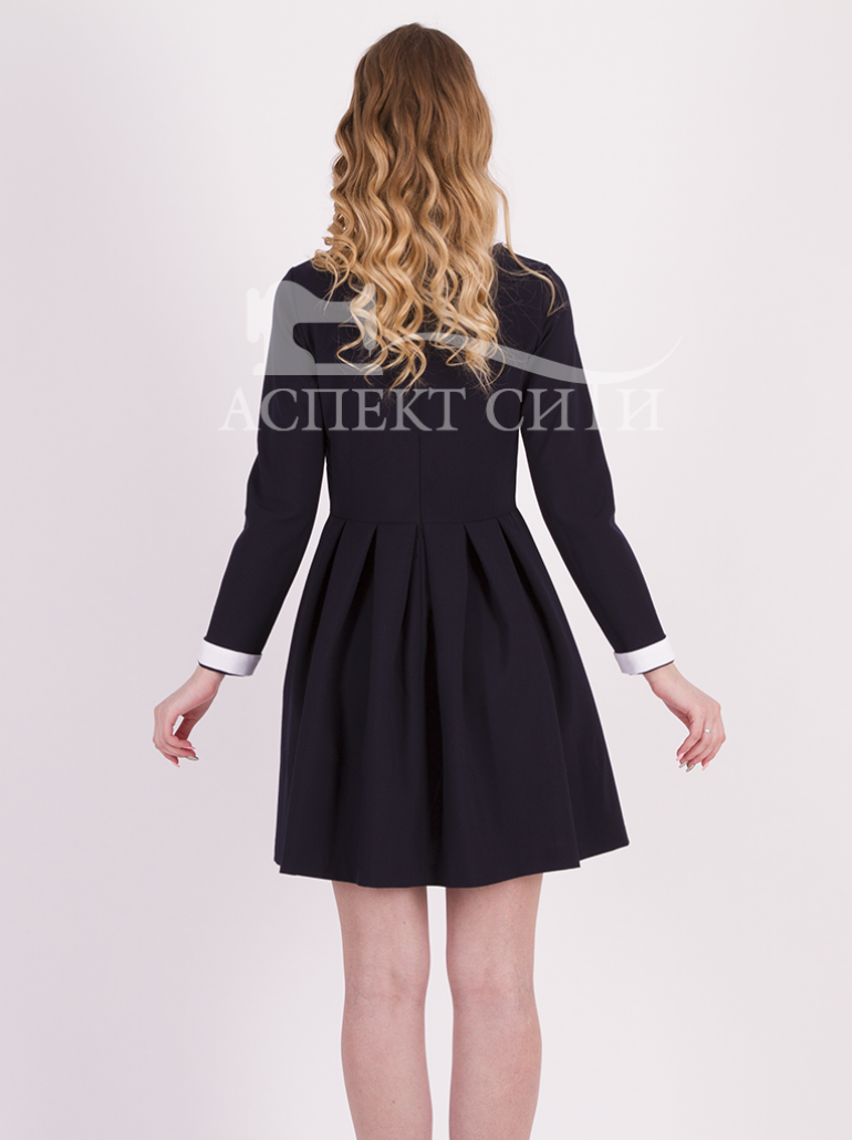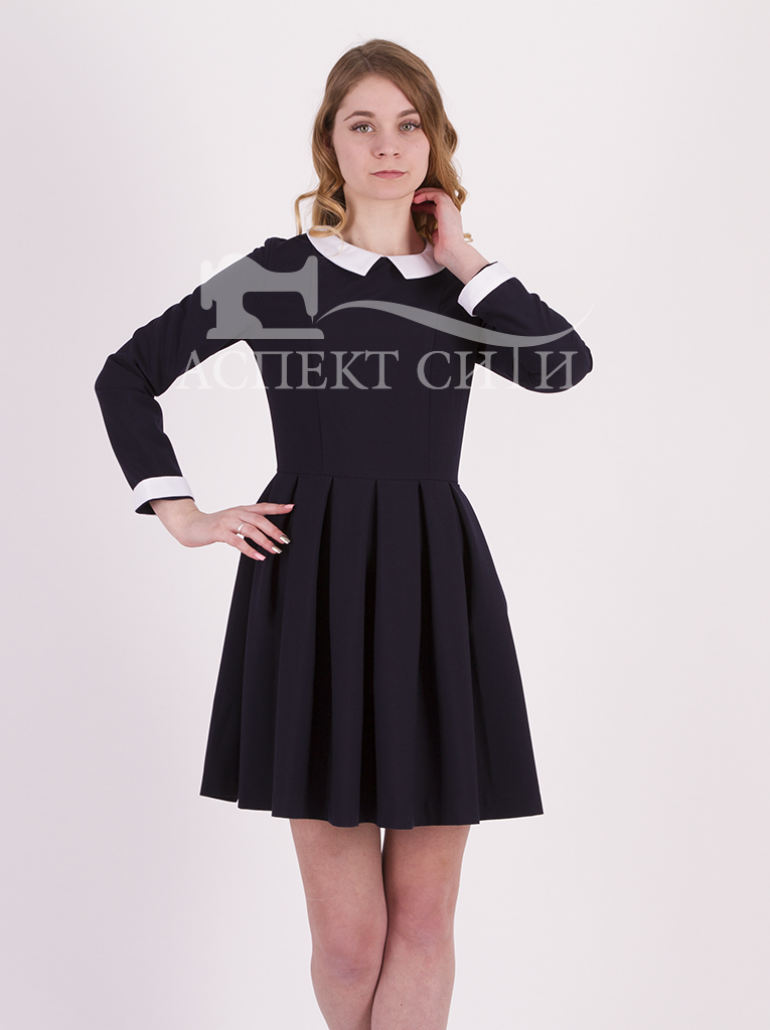Школьное поливискозное платье синего цвета, прилегающего силуэта, отрезное по линии талии. Лиф платья с вертикальными рельефами на полочке, юбка в складку, рукав длинный. В среднем шве спинки молния длиной 50 см. Платье комплектуется пристегивающимися на петли-пуговицы манжетами и воротником остроугольной формы белого цвета. Ткань платья - мягкая, дышащая, с 30%-ным содержанием вискозы, что позволяет использовать его на каждый день.