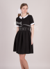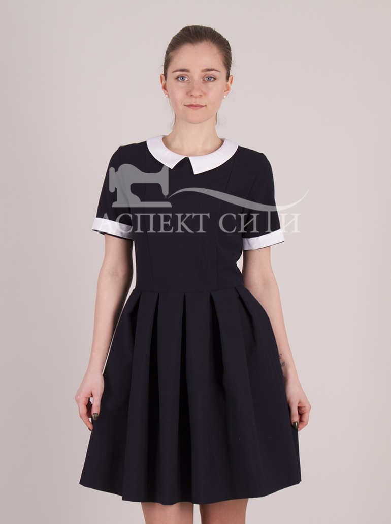 Школьное поливискозное платье синего цвета, прилегающего силуэта, отрезное по линии талии. Лиф платья с вертикальными рельефами на полочке, юбка в складку, рукав короткий. В среднем шве спинки молния длиной 50 см. Платье комплектуется пристегивающимися на петли-пуговицы манжетами и воротником остроугольной формы белого цвета. Ткань платья-мягкая, дышащая, с 30%-ным содержанием вискозы.